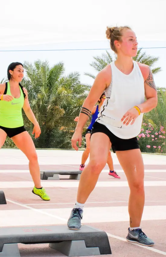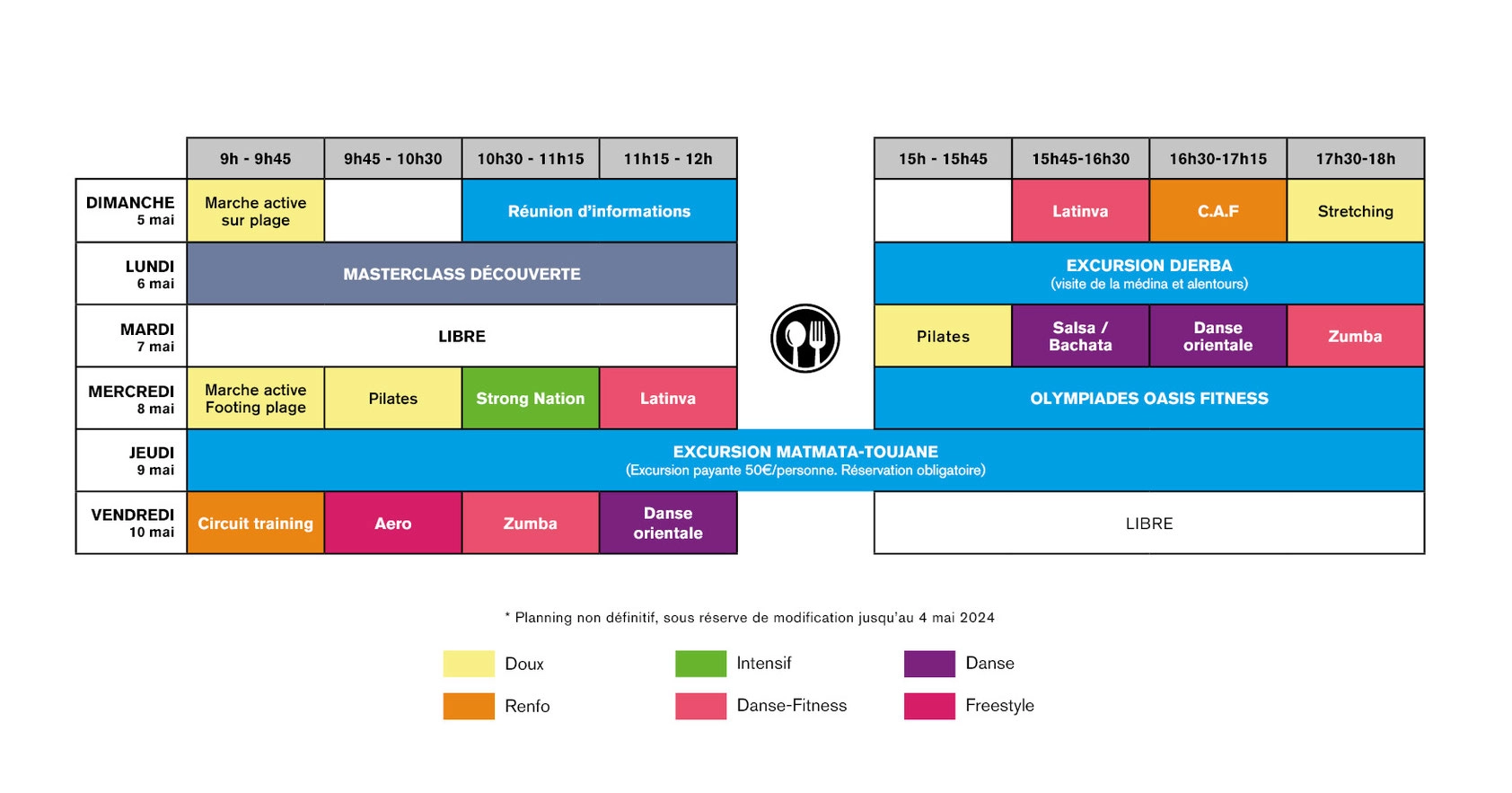 taxe de séjour, navette aéroport Djerba > Hôtel aller-retour, 1 masterclass, 20h de fitness et danse, 1 excursion, un package de bienvenue, l’accès aux animations de l’Hôtel.